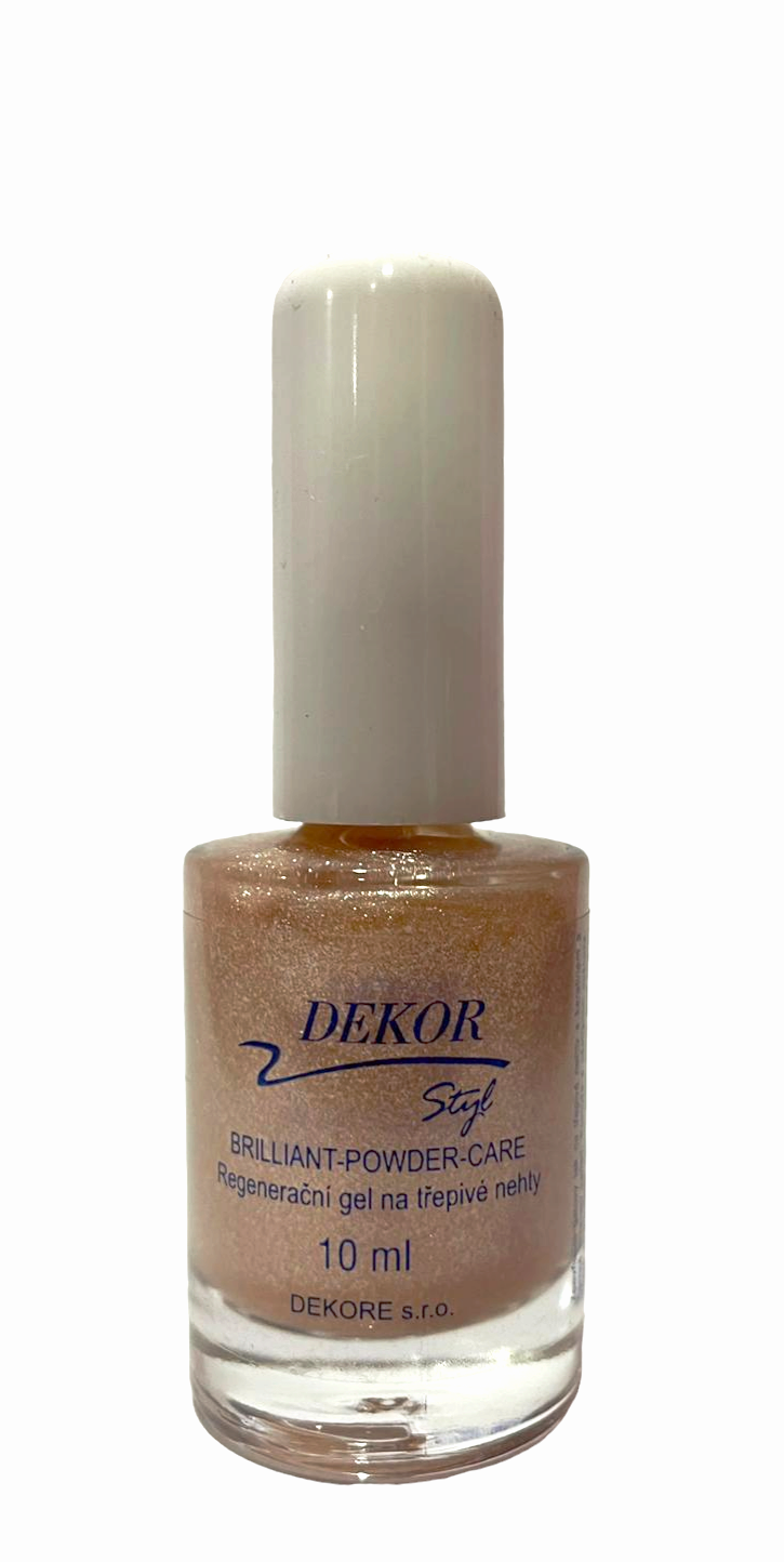 BRILLIANT-POWDER : Silně zpevňující ,vysoce přilnavý lak s růžovým nádechem a perletí.Třepivé konečky okamžitě zacelí a nehty silně zpevní.Jemná narůžovělá perletˇ zlehka zakryje barevné nerovnosti nehtů.