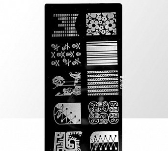 Razítkovací destička -  pro razítkování použij laky tomu určené  a razítko se stěrkou .  Pro dokonalý efekt pracuj rychle  Nezapomeň odstranit vrchní krytí destičky .